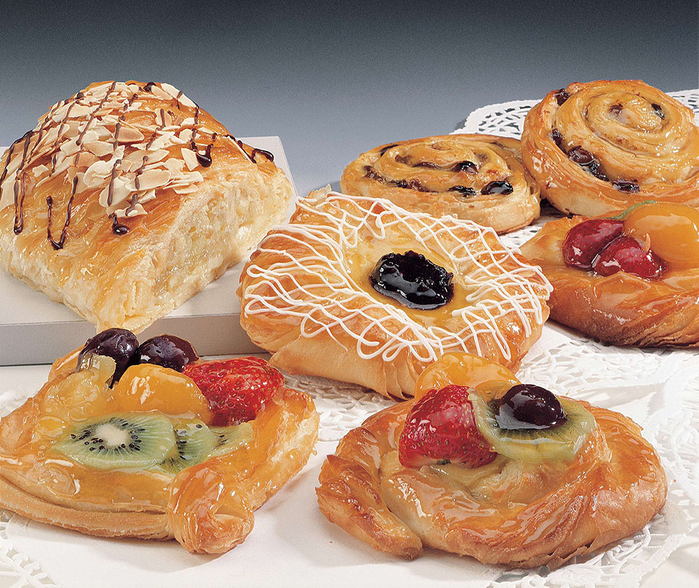 Equally as delicious are our Danish Pastries. Made with premium protein flour and high grade unsalted butter, the laminated dough is repeatedly covered with butter and folded over, then filled with a creamy vanilla custard and topped with either apricots, blueberries or apples. You can choose boat or square shape mixed fruit cartons. Just prove and bake these light, flaky delicacies to please your customers anytime of the day.