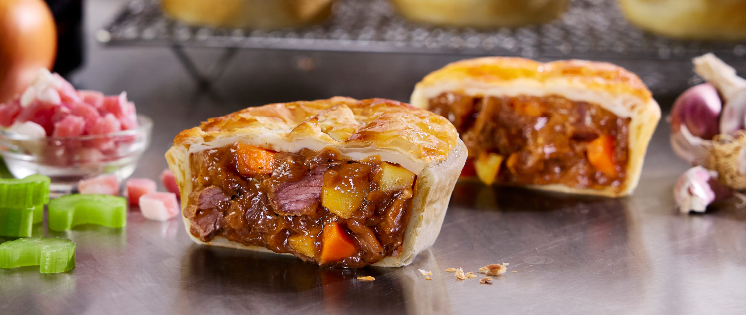 Once cooled, fill pie bottom pastry as normal and top with puff pastry, egg wash and then punch a vent hole in the top of the pie.